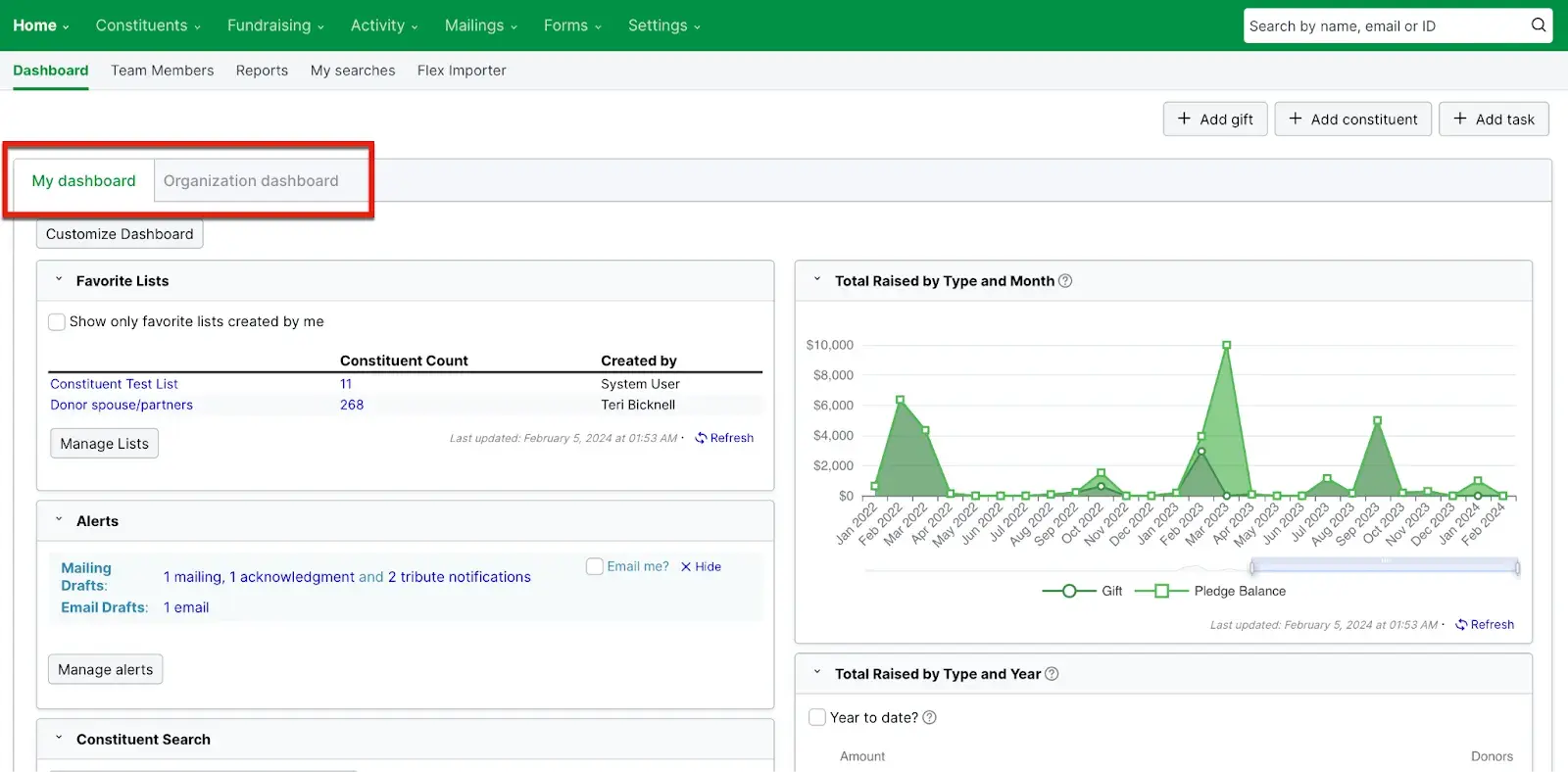 - 360-degree constituent view: Track every touchpoint from first website visit through significant gift in one timeline, ensuring any staff member can converse with supporters.