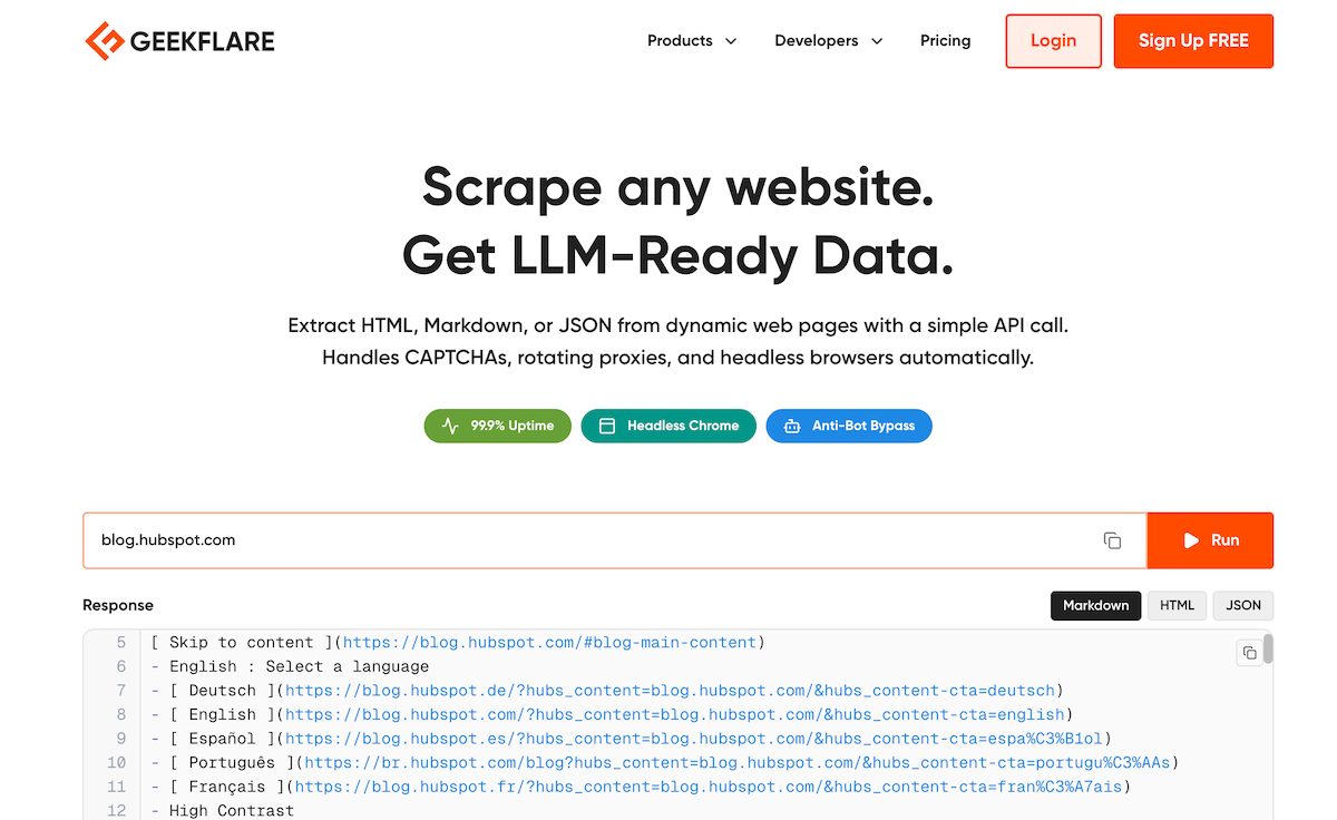 The Geekflare Scraping API solves the complexity of modern web scraping. Instead of simply downloading raw HTML, this API handles the headless browsing, JavaScript rendering, rotating proxies, and CAPTCHA solving to access target pages successfully.